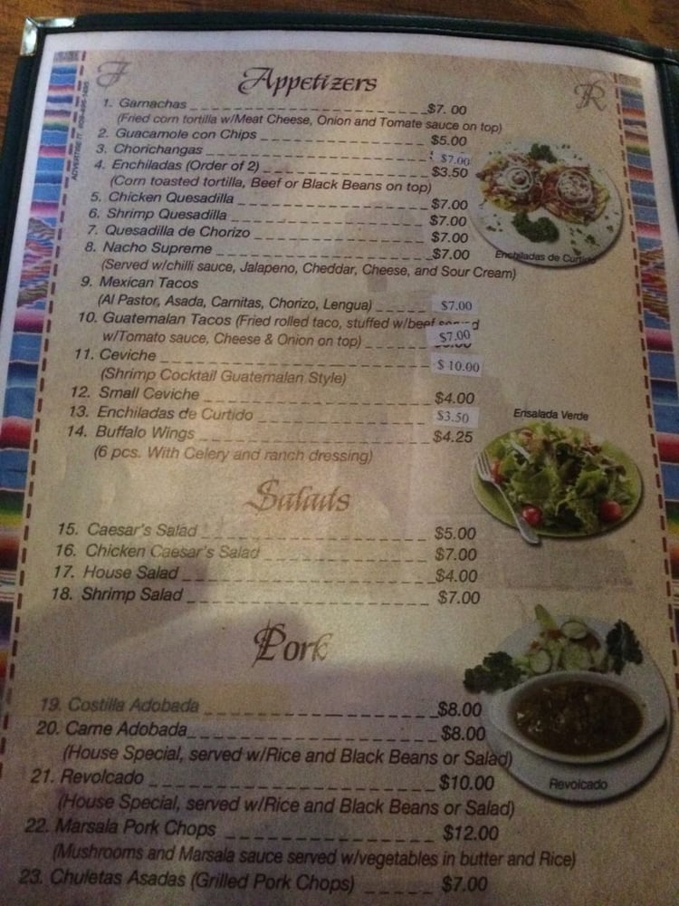 Start your culinary journey with the Caldo de Mariscos, a hearty seafood soup brimming with clams, shrimp, and fish, or savor the Mojarra Frita, a perfectly fried porgy served alongside rice and salad. The menu also features enticing tacos, including the traditional Tacos Mexicanos and Tacos Guatemaltecos, offering a delightful blend of textures and flavors.